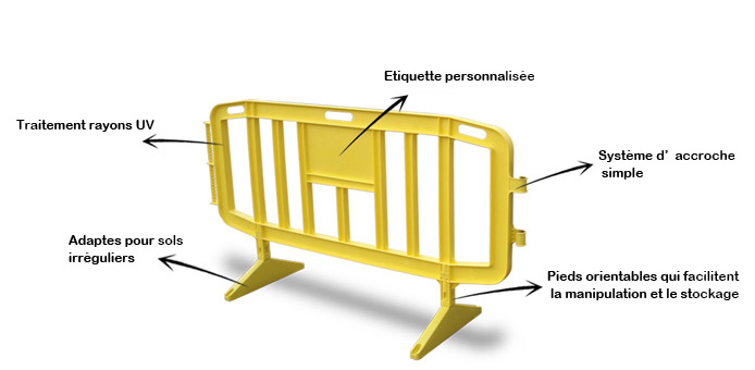 Barrières en polypropilène renforcé, résistantes, stables et facilememt transportables et empilables. Elle son 100% recyclables et simples à monter.