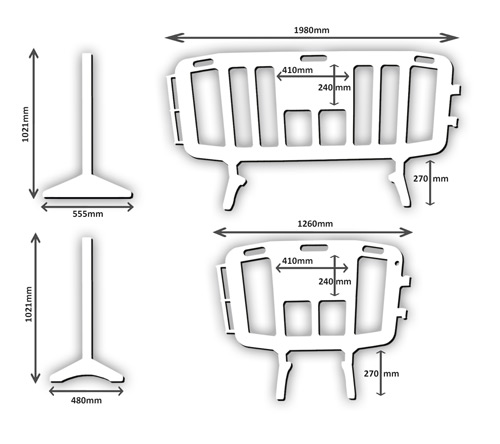 Elles ont une hauteur de 1021 mm, sont disponibles en deux largeurs (1980mm et 1260mm) et 6 couleurs. Il est de plus possible d’insérer un marquage personnalisé dans la zone centrale. Les deux tailles peuvent se combiner afin de créer une solution adaptée à toute situation. Poids de 9,2 kg pour le grand modèle et 6,5Kg pour le petit.