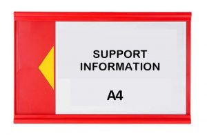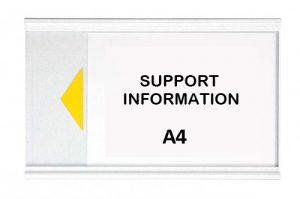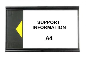 Panneau d’information pour la mise en place d’un message A4, protégé par une vitre PVC coulissante. Indication de direction par flèches apparentes ou non.