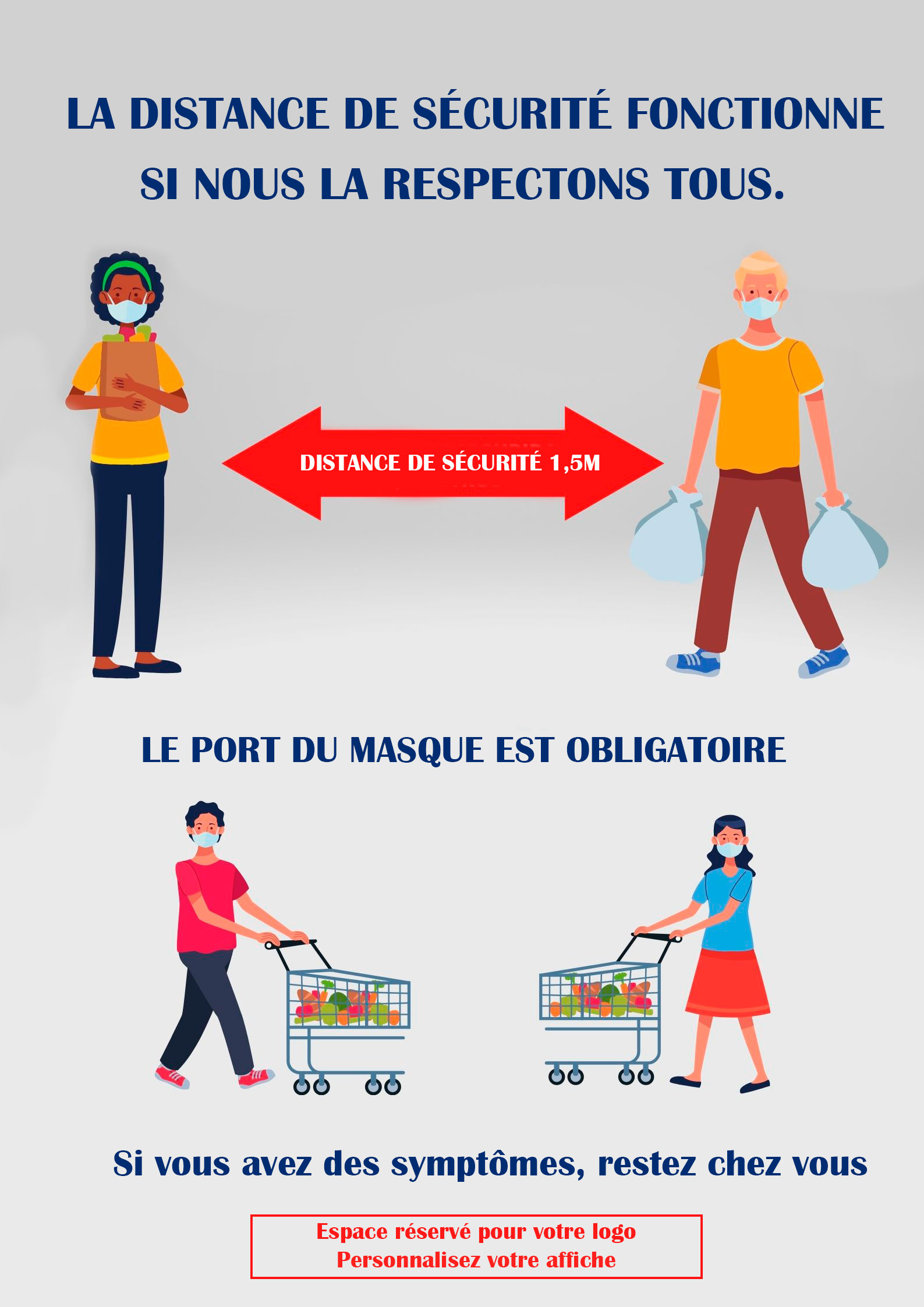 Affiche / Panneau de sensibilisation et prise de conscience face au COVID-19 « La distance de sécurité fonctionne si nous la respectons tous. Le port du masque est obligatoire« . Affiche idéale pour les grandes surfaces, commerces. Sensibilisation au respect des distances de sécurité et port du masque lors des courses alimentaires. Elle contient également la phrase » si vous avez des symptômes, restez chez vous« .